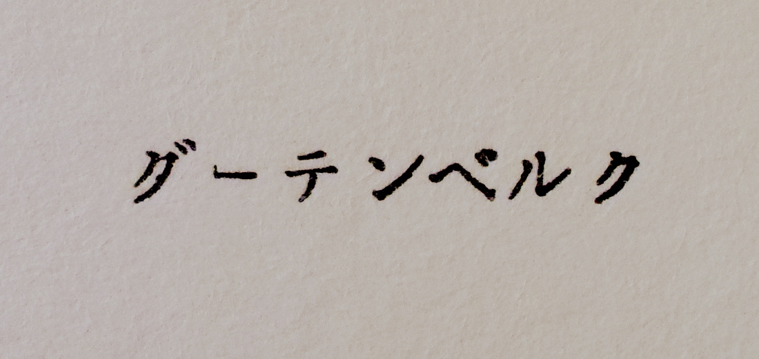 グーテンベルクを「グ」「ー」「テ」「ン」「ベ」「ル」「ク」という金属活字で印字する。